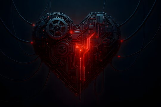 Two advanced robotic figures facing each other with glowing red circuits and heart in a dreamy bokeh background
