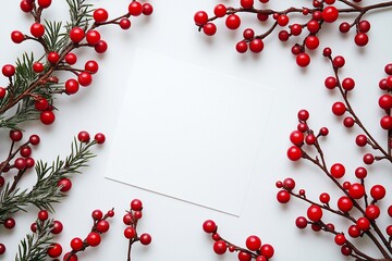 White card with a red border is placed in the center of a bunch of red berries. The berries are arranged in a circular pattern around the card. Mockup of White Greeting card in landscape position