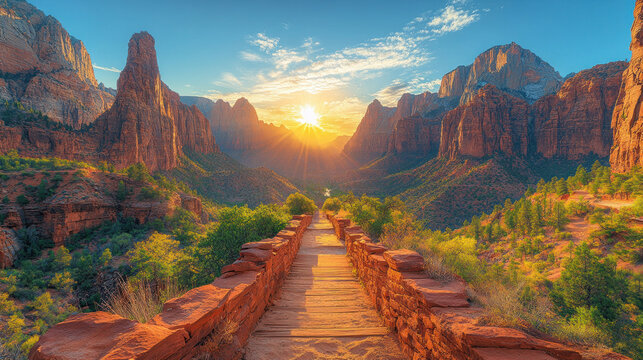 Zion National Park's dramatic red cliffs and winding trails under a clear blue sky