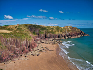 Expansive beach with red cliffs and blue sky, presenting a serene and natural seaside environment, AI generated