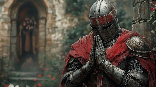 Hooded assassin warrior on fortress battlement amidst dark skies