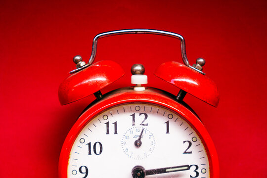 Old red clock on red background. Alarm clock. Photos represent time, work and changes.