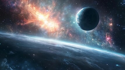 A planet is floating in space with a bright orange and red cloud in the background. The planet is surrounded by a lot of stars and the sky is filled with them