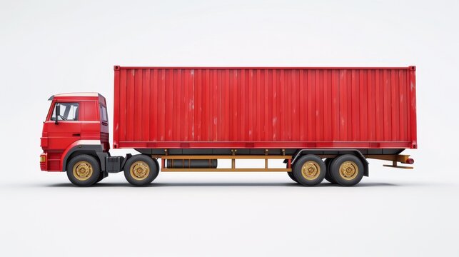 White truck transports red container against container wall. Illustrates global import export logistics. Shows international supply chain, worldwide freight transport business. Transportation of
