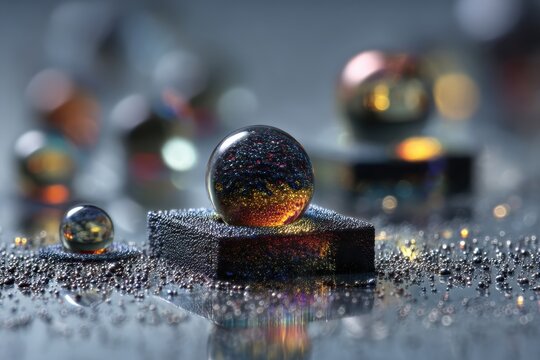 A surreal macro scene featuring glass-like reflective spheres with glowing amber and red cores placed on a textured dark surface scattered with tiny metallic particles
