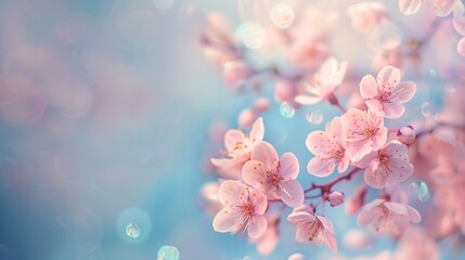 beautiful blooming cherry flowers on a blurred background, creating a bokeh effect. The flowers have a soft pink color with yellow and red cores