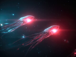 Two mysterious, bioluminescent creatures with glowing red cores and translucent tendrils drift through a dark, particle-filled, ethereal abyss.