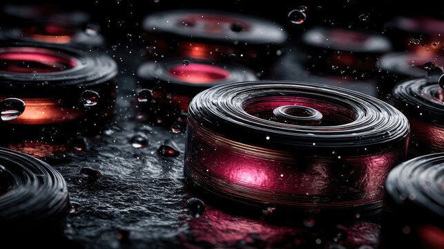 Row of cylindrical objects with glowing red cores, textured surface, and water droplets.
