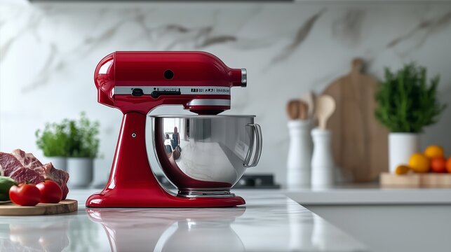 A red kitchenaid mixer on the counter of an all white modern and bright kitchen, with ingredients like steak, vegetables and fruits around it