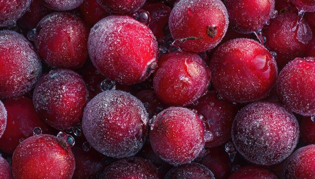 Frosted, red cranberries close-up, some with water droplets