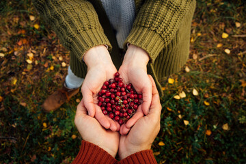 Fresh ripe cranberries in bowl on grey table, top view. Space for text