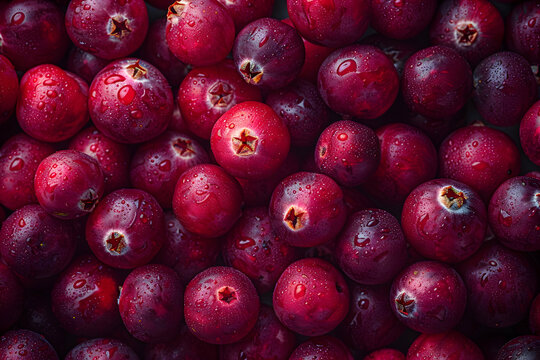 Floating, glossy red cranberries with water droplets against a bright white backdrop