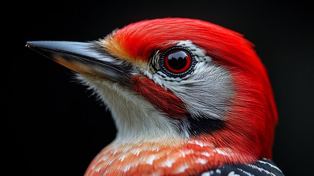 A macro view of a woodpeckers red crest with detailed feather textures