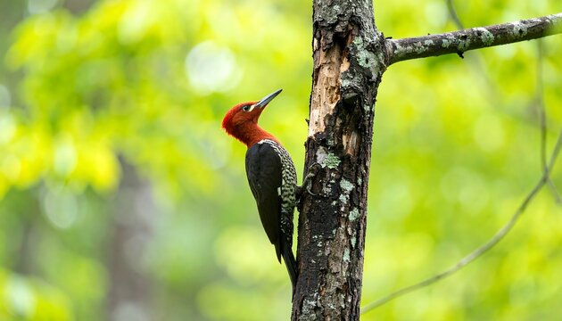 A vibrant woodpecker, showcasing its striking red crest and dark plumage, perches on a weathered tree trunk, amidst a blurred backdrop of lush greenery.