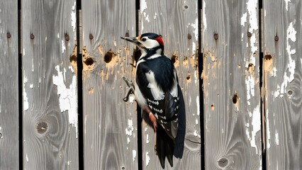 Black and white woodpecker perched on weathered wooden fence with holes black and white bird red crest