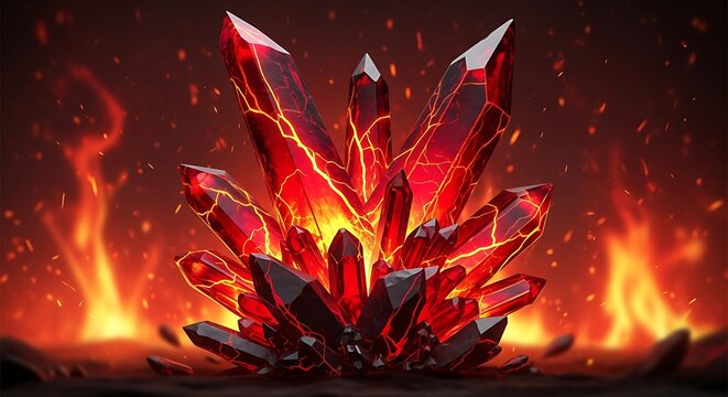Shimmering red crystal shards scattering across dark textured surface