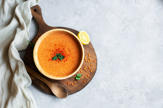Traditional Turkish red lentil soup with ingredients in bowl on rustic table