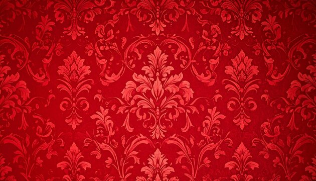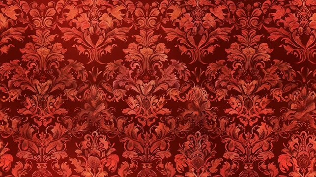Closeup of a red damask pattern with intricate floral and leaf designs