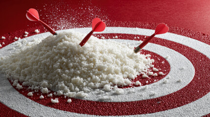 A red dart with a gold tip is stuck in the center of a black and white target with a red bullseye.