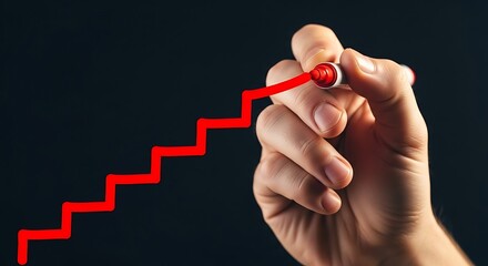 Hand drawing a red chart line with an upward trend indicating business growth and success on a white background using a black marker pen with a red tip.