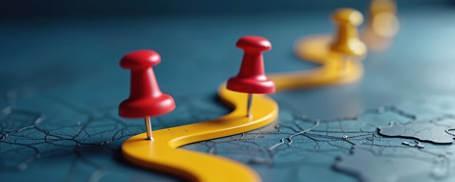 Yellow path with red and yellow pins mark stops on world map. Strategy planning shows goals direction. Business progress follows timeline markers to achievement.