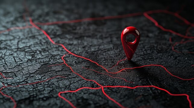A bright red location marker highlights a point on a dark, textured map surface. Winding red lines represent routes, creating a striking visual in a digital environment