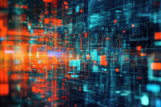 A complex digital network of glowing lines and code streams represents advanced data processing