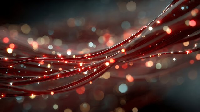 Dynamic flow of glowing red data streams with vibrant bokeh lights creates a modern technological abstract background perfect for digital innovation
