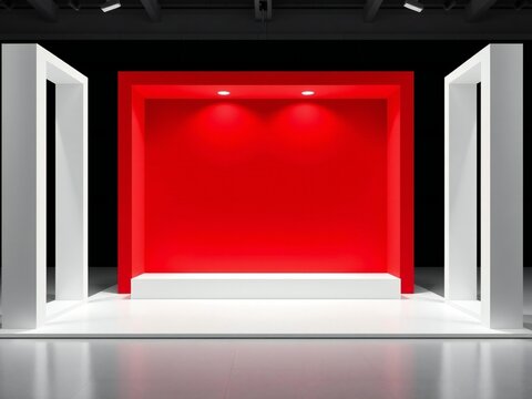 A minimalist red display featuring a round pedestal and an elegant border, perfect for showcasing products or decorative items.
