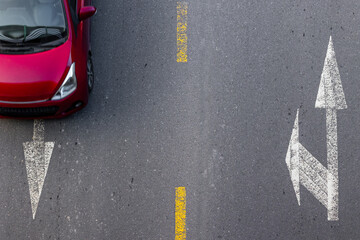 Red car on asphalt road with diverging white arrows and yellow lines
