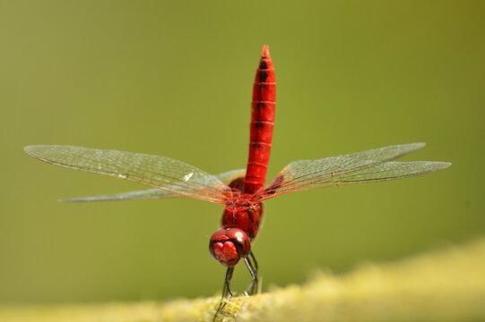 a red dragonfly (crocothemis servillia) perched on dry grass