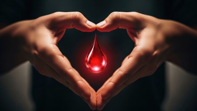 Hands forming a heart shape with a glowing red drop of blood.