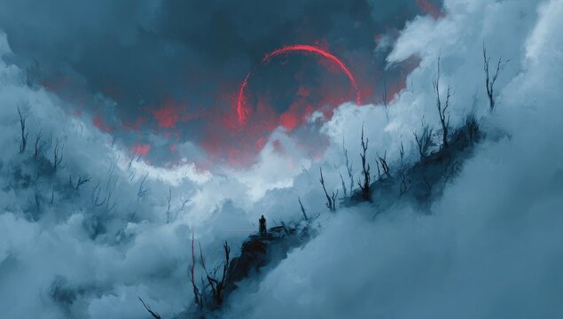 Apocalyptic fantasy landscape lava river blood red eclipse