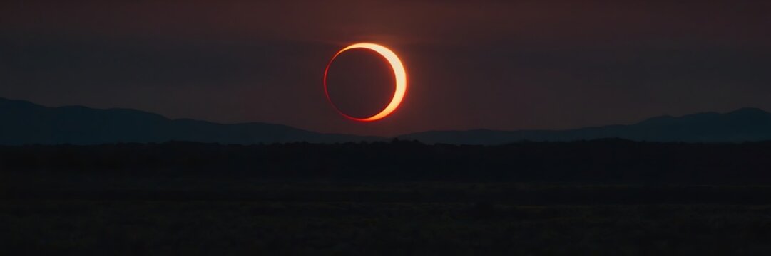 A breathtaking solar eclipse with a radiant red corona illuminating the darkened moon against the black sky, creating a mesmerizing celestial display.