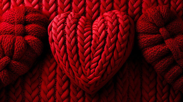 three red hearts, knitted ball of red wool, woven wool pattern, red wool sweater. concept of love, valentine's day, affection, wedding day. AI generated