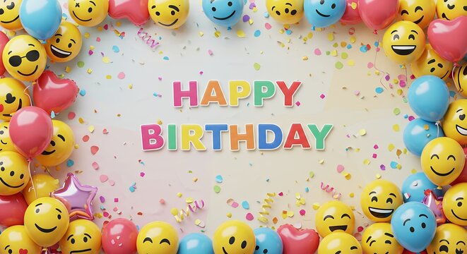 Smiling emoji characters with red hearts and spheres scattered on a bright blue background
