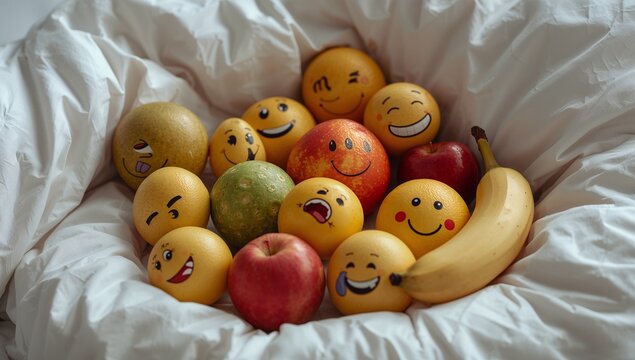 A collection of colorful fruits, each adorned with diverse and expressive emoji faces, nestled within a soft white sheet.