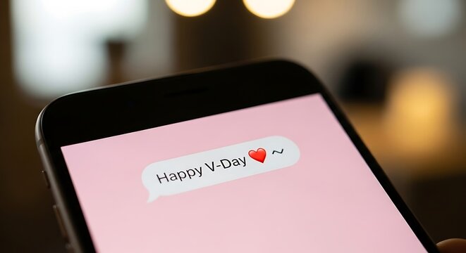 Smartphone screen Happy V Day text message with red heart emoji on pink background