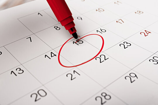 Calendar page with red pen close up. Focus on number 15 in calendar and empty red circle for design in your ideas and work concept