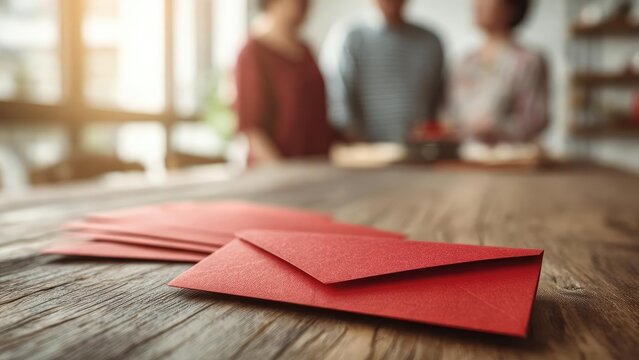 Red envelopes arranged on a rustic wooden table, with a blurred group of people in the background. Concept Red Envelopes, Rustic Wooden Table, Shallow Depth of Field, Blurred Group in Background