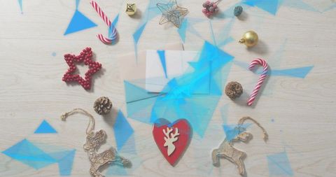 Red heart reindeer ornament on light wood table with envelopes, candy canes, pinecones