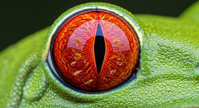 Extreme close-up of a vibrant red eye of a green tree frog, showcasing intricate patterns and a vertical pupil against a blurred dark background.
