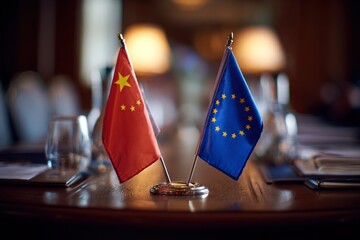 A pair of small, symbolic flags stand upright on a polished wooden conference table, set against a softly blurred background. One flag displays a vibrant red field adorned with five yellow stars, whil