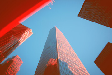 Low angle view of skyscrapers against a clear blue sky with a red filter effect