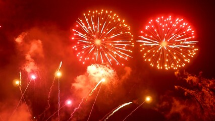 Red Firework celebrate anniversary happy new year 2023, 4th of july holiday festival. red firework in night time celebrate national holiday. Countdown to new year 2022 festival party time event