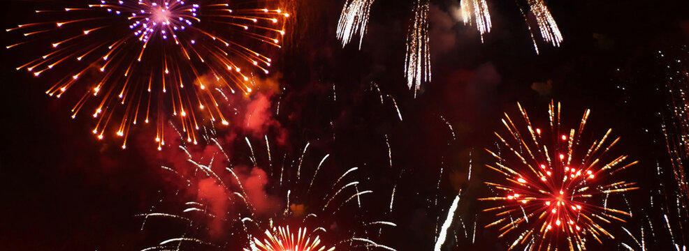 Banner Red Firework celebrate anniversary happy new year 2024 4th of july holiday festival. Banner red firework night time celebrate national holiday. Countdown new year 2025 festival with copy space