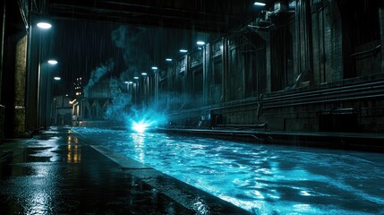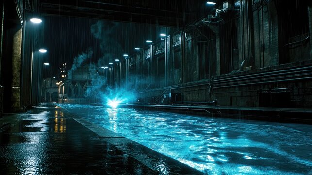 Urgent red beacon flashes casting dramatic reflections on wet surface creating a sense of emergency and alarm