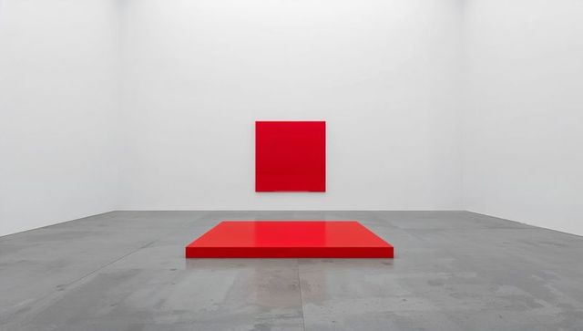 Minimalist red square installation in gallery with glossy platform and wall panel