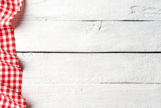 Red gingham tablecloth on white vintage background with copyspace
