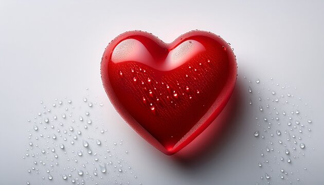 red glossy heart in dew drops on a white background